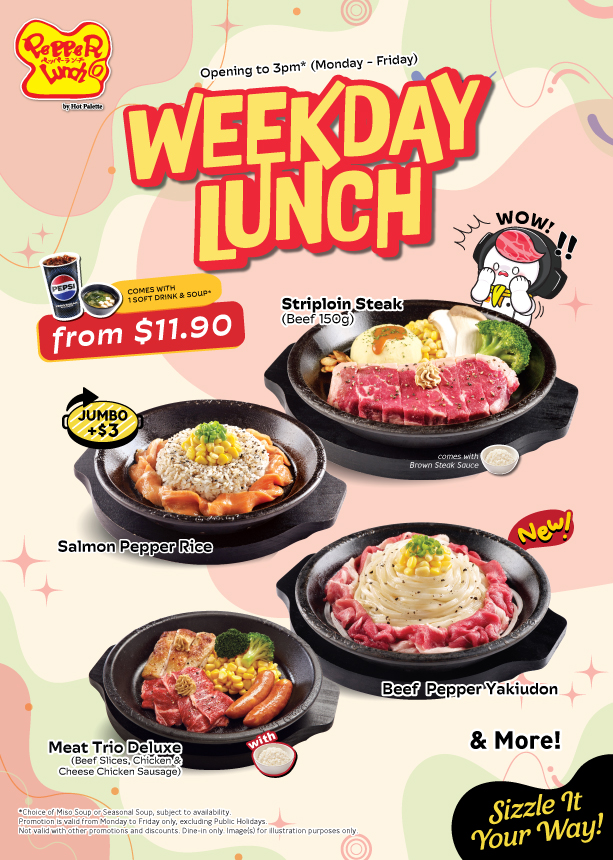 Elevate your weekdays with our Tempting Weekday Lunch Deals! Pick from delectable selections such as Striploin Steak and Beef Pepper Yakiudon, available at a deal you simply can't resist!